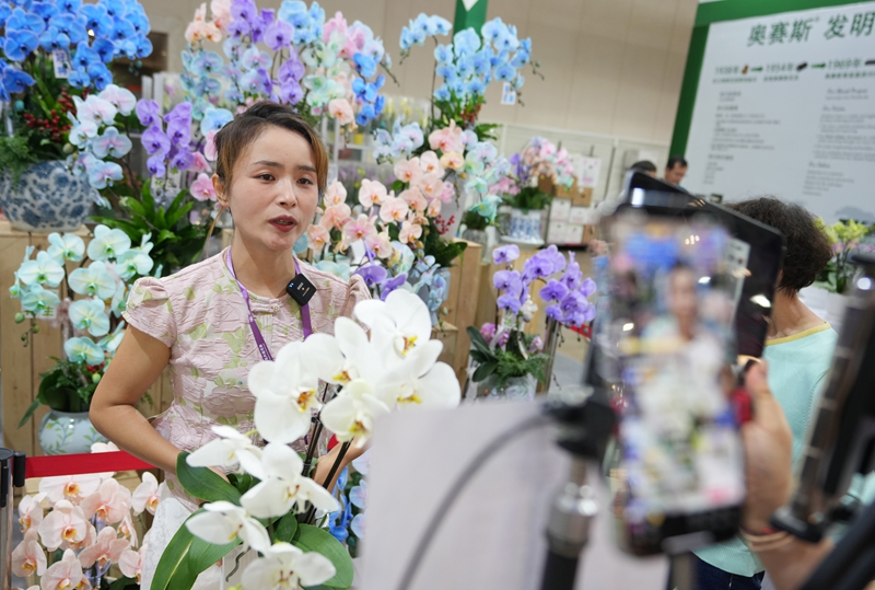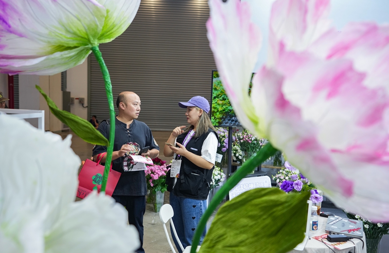 9月20日,参观者(左)和参展商在第二十二届中国昆明国际花卉展上洽谈合作。