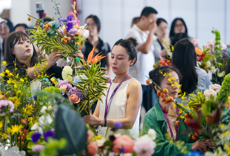 9月20日,参赛选手在第二十二届中国昆明国际花卉展花礼创意大赛上制作花束。