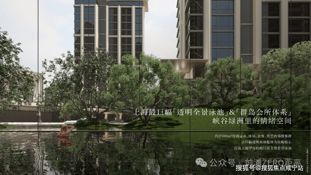 在这里,会所不再只是平面盒子,而是峡谷绿洲里的情绪空间。约2500㎡六大功能岛屿集群,集运动、休闲、会客、赏艺于一体,更以巨幅透明玻璃舱体为结构核心,打造上海罕有的超尺度全景悬浮泳池,实现对岸森林、空中云架与泳池波光的全景框景。