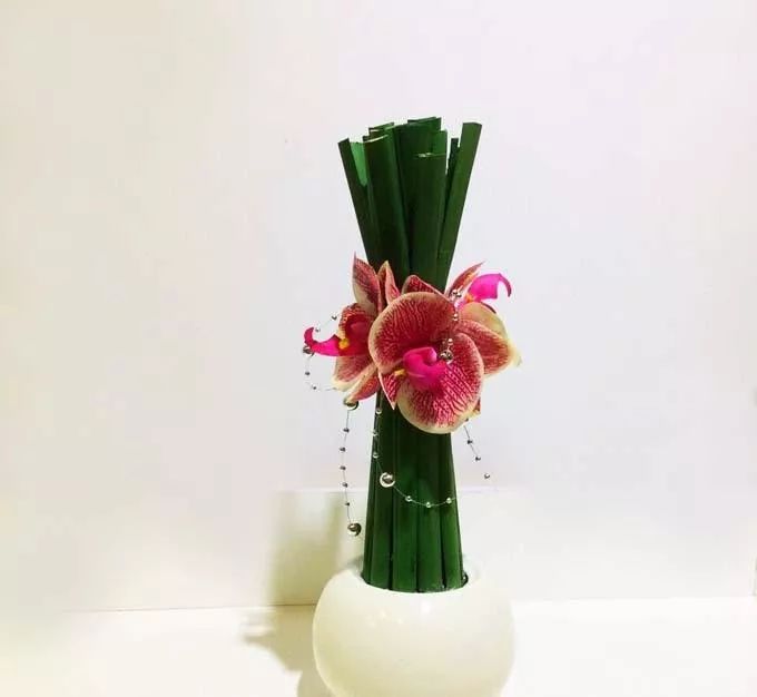 上面的花非常简单吧,富贵竹加两朵百合,还有下面的枝条,缠上三四朵蝴蝶兰,迎宾花就完成了,而且这样的花束能摆上一个星期都可以,不需要过多的打理。