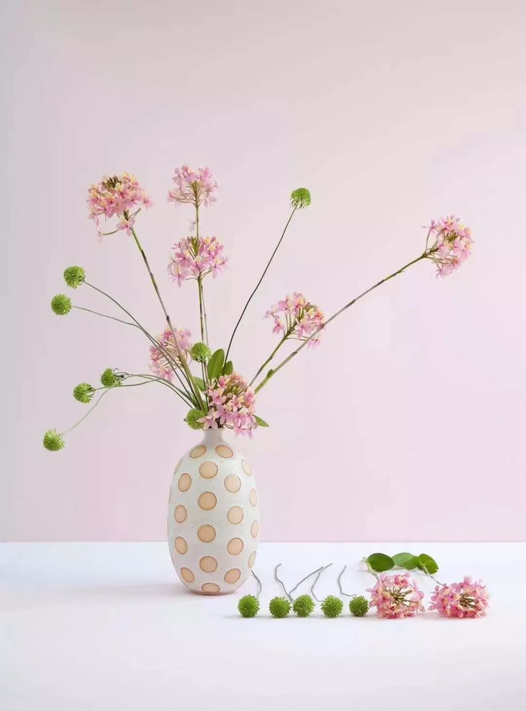 欢迎年轻女士的时候,用这样粉色的花瓶及寥寥可数的几枝花,简简单单的就衬托了青春的氛围。想不喜欢都难,谁叫花器是如此可爱呢,圆点有自己的腔调,但绝不抢走花的光芒。