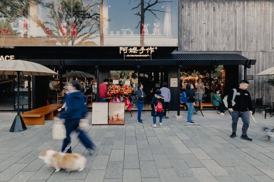 选址严苛的阿嬷手作也来到了EKA·天物。门店延续了品牌古朴的中式茶肆场景,店前古树环抱、水景如镜。以屋檐为引,把室内外连成一片。