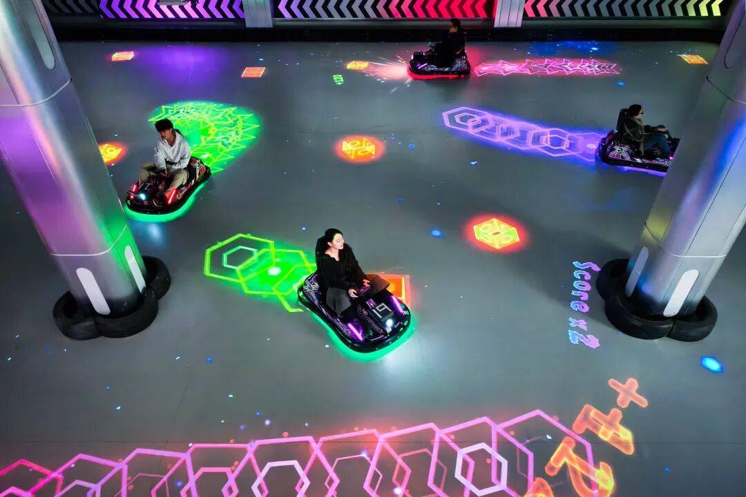 赛博朋克风、全息投影的室内卡丁车体验,提供贪吃蛇、抢占格子等多元交互体验及团战玩法。