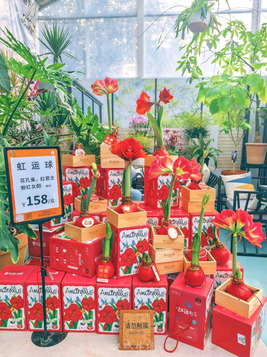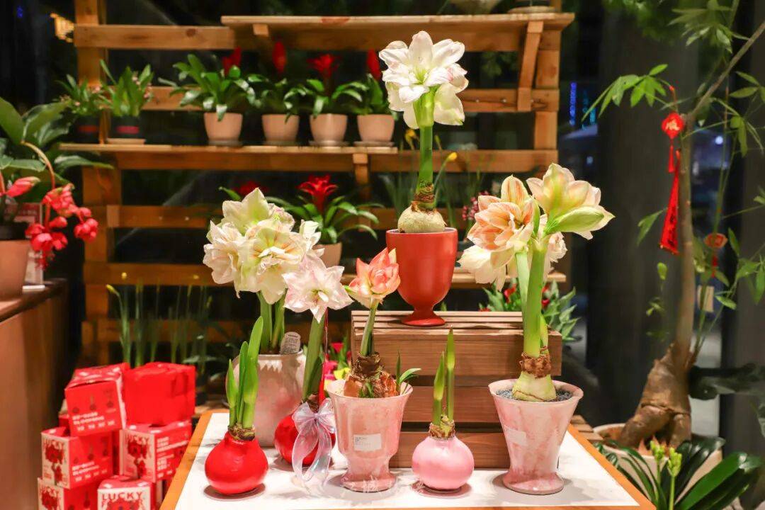 如果说蝴蝶兰是“颜值担当”,那朱顶红则是近几年悄然走红的年宵花新宠。在园科院绿色驿站的年宵花市里,朱顶红种球集中亮相,“花孔雀”“红君主”“粉红女郎”等品种尚未开花,却已让人充满期待。