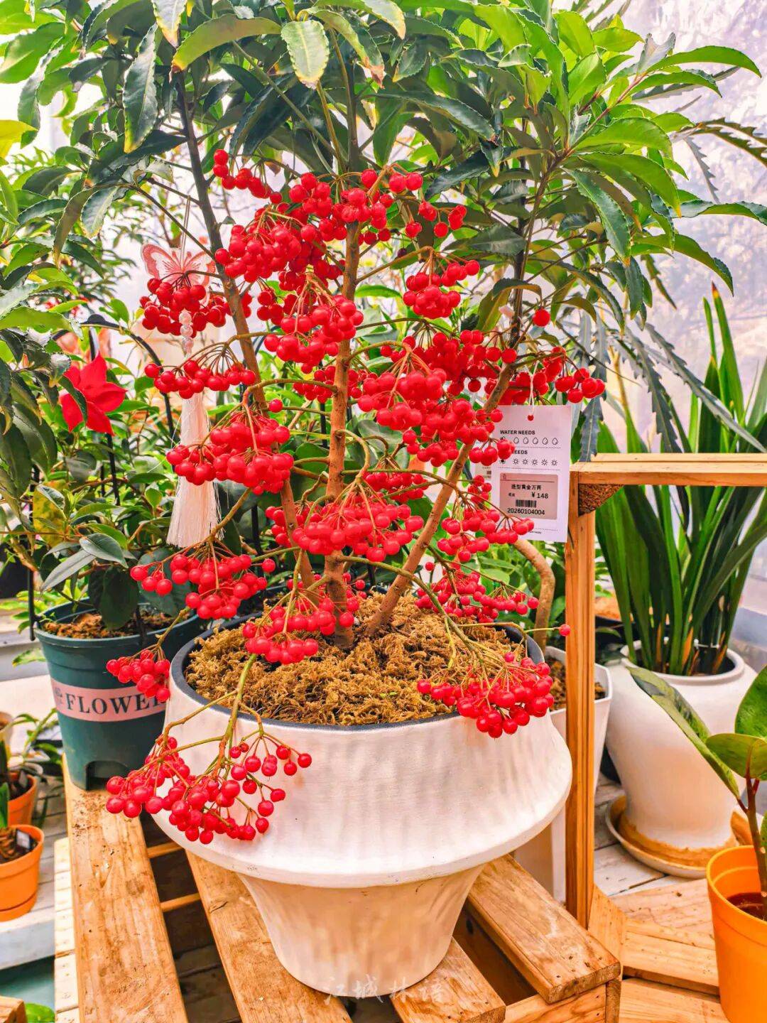 在园科院绿色驿站,一盆挂满红果的“黄金万两”富贵籽格外醒目。它在初夏开花,到岁末时枝头果实累累,红果与绿叶相互映衬,看起来玲珑喜庆,也因此成为年宵花中的常客。这类植物耐阴、好养,非常适合室内摆放。不过需要提醒的是,果实虽然诱人,但不能食用,有小朋友的家庭要注意摆放位置。