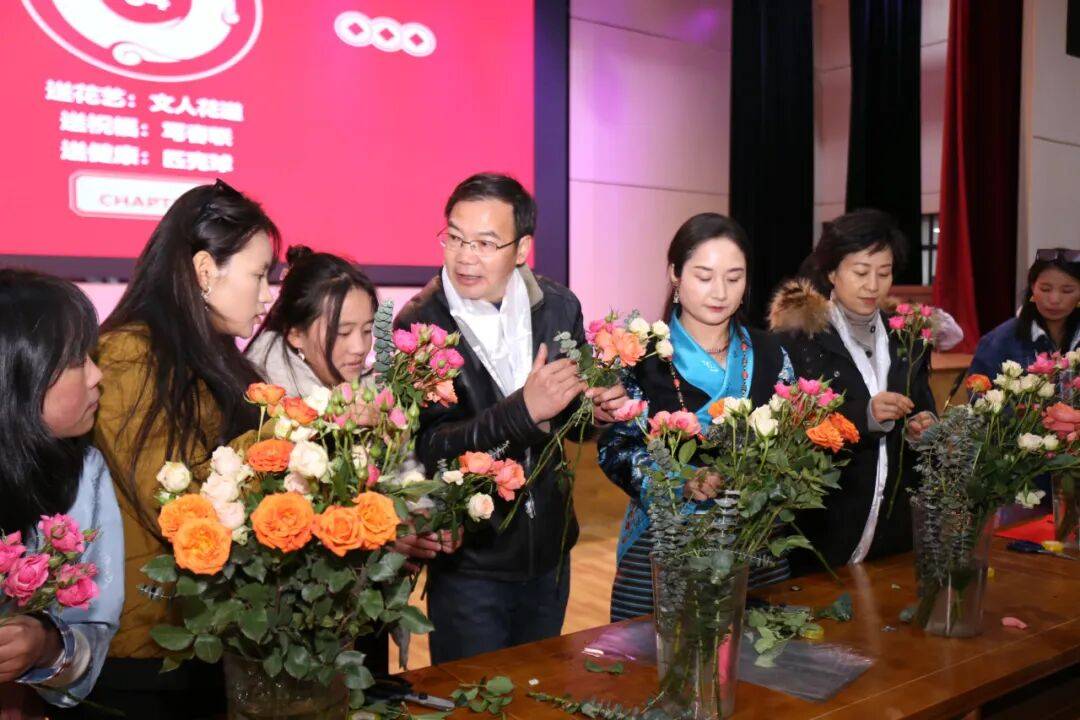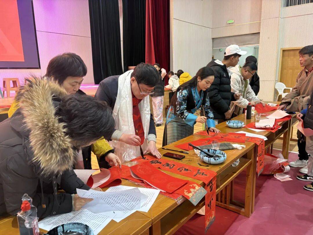 活动紧紧围绕“送健康、送文化、送花艺、送祝福、送温暖”的暖心主线,精心策划了一系列丰富多彩的环节。花艺创作区里,学生们跟着老师的指导,修枝剪叶、配色造型,创造出了精美的新春花艺作品;长桌前,同学们挥毫泼墨,写下一张张喜庆的“福”字与藏语“扎西德勒”,字字句句都承载着对家乡繁荣兴旺、幸福绵长的诚挚祝愿。