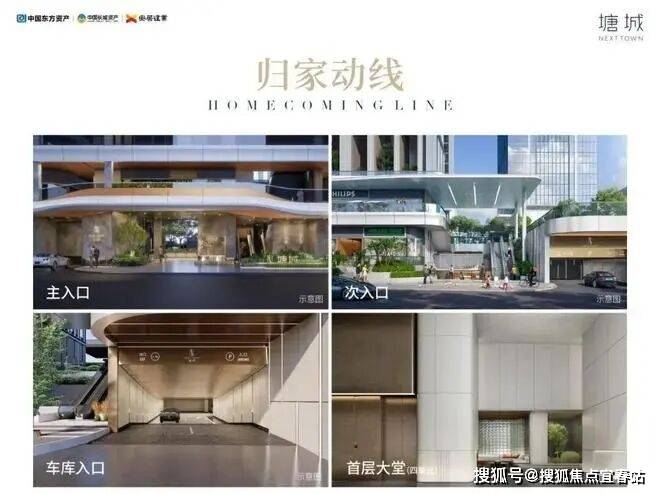 酒店化主入口、次入口、车库入口、首层大堂,酒店化迎宾与归家动线,以无风雨通廊为核,赋予归家更多体验感,带来高效、安心的归家出行之旅。