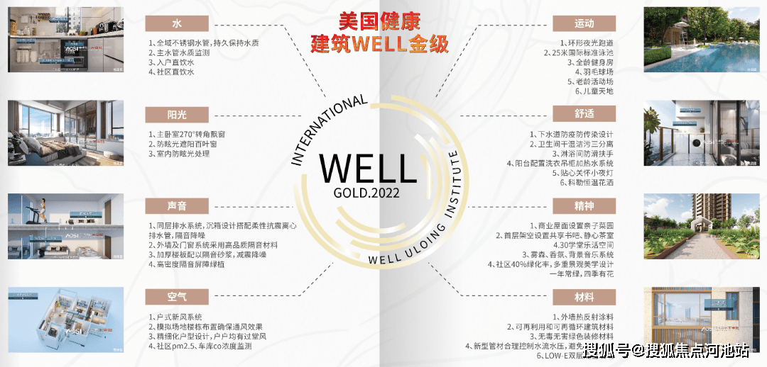 阳光香格里将well健康标准中的空气、水、声音、阳光、运动、舒适、精神和材料八大部分贯彻在住宅的每个角落,这八大健康类别包括包括102项特性,每个特性旨在解决住户健康、舒适性或认识等方面。