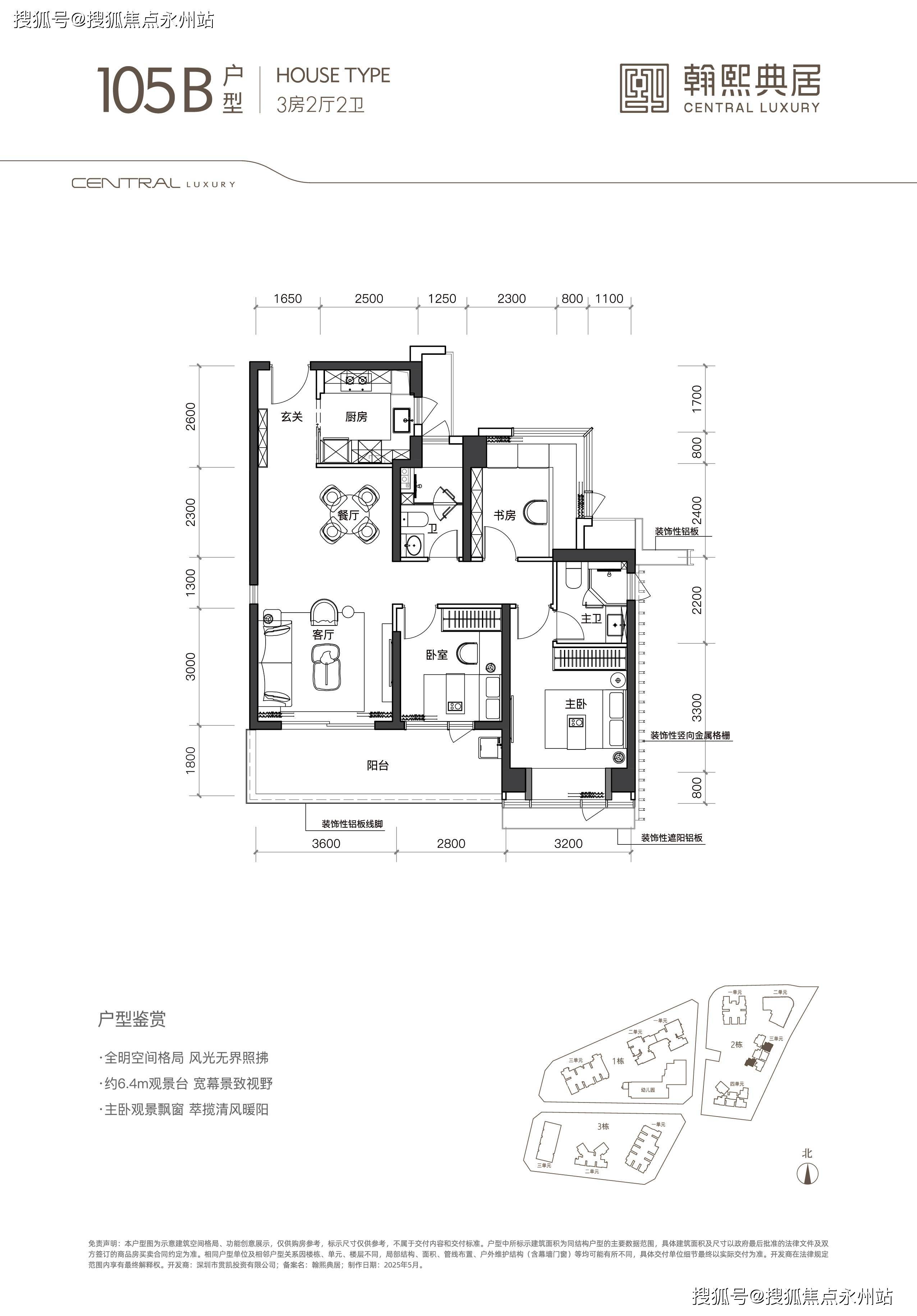 105㎡3房2卫:双龙抱珠格局,朝东/南,阳台开间6.5米,折后总价约894万起(单价8.5万起)。