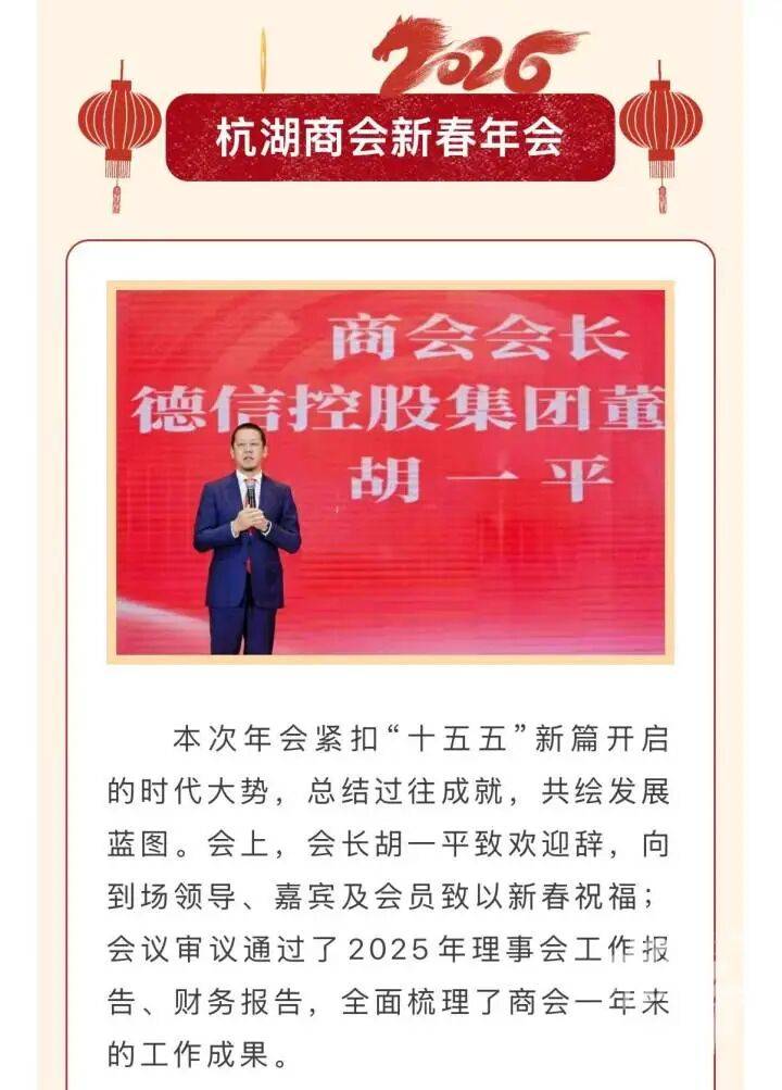 浙江省房地产业协会官网1月14日更新的信息显示,该协会会长为胡一平。另据湖州商会青年联会消息,1月10日,杭州市湖州商会三届四次会员大会暨2026新春年会在杭州举行,300余名会员参加,胡一平出席并致欢迎辞。