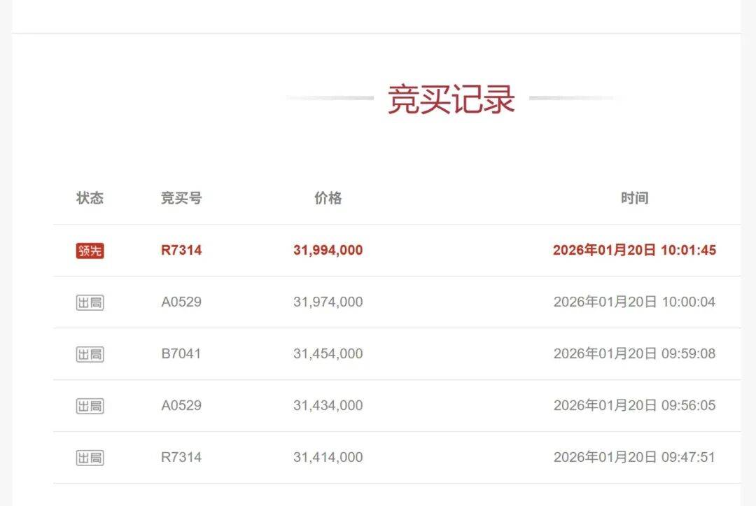 有意思的是,直到1月20日上午9:47,只有1位竞买人“R7314”报名且出价。但离法拍结束还剩下几分钟时,另外两位竞买人“A0529”“B7041”突然出现,将价格加到3197.4万元。